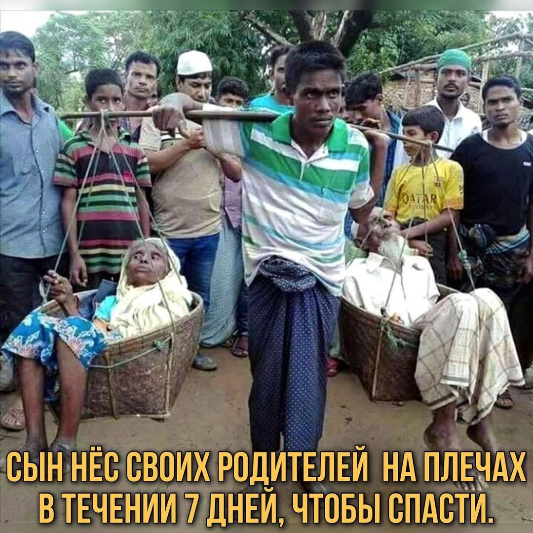 В 2018 году, мусульманин из Мьянмы семь дней нес на себе немощных родителей по пути в лагерь беженцев. Фотография Мухаммеда Аюба, который несет на себе в корзинах мать и отца, взбудоражила пользователей социальных сетей. Мусульманина прозвали «символом человечности»: превозмогая боль, усталость и страх, молодой парень не оставил своих родителей в беде. Отправившись в путь босиком, Мухаммед посадил мать и отца в корзины, которые привязал к деревянной палке, и в течение недели нес их на себе. Путь Аюба пролегал через горы, леса и болота. Мухаммед рассказал, какие ужасы ему пришлось пережить у себя на родине. «Солдаты бирманской армии сжигали дома, насиловали женщин, убивали ни в чем неповинных местных жителей. Поэтому бегство стало нашим единственным спасением», - сказал Аюб. Но на этом испытания не закончились: в лагере для беженцев Кутупалонг рохинья оказались в тяжелых и непригодных для жизни условиях. «Через 45 дней после прибытия в Кутупалонг отец скончался. Моя мать парализован