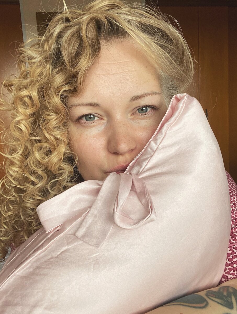 Сон на шёлковой наволочке с высокой причёской «ананас» — верные помощники, чтобы сохранить текстуру кудрей до утра. Два ключевых момента: — шелковая нить наволочки создаёт минимальное трение ночью, следовательно, помогает избежать спутанности волос (особенно у шеи); — а высокая и не тугая прическа позволяет кудрям не сминаться во сне. Могу с уверенностью сказать, что ощутима разница без шёлковой наволочки: 2-3 ночи без неё и уже потребуется больше времени в ванной на распутывание волос. Давно стала для меня не элементом роскоши, а ежедневной необходимостью. Приятный бонус к сохранению укладки — отсутствие отеков и заломов на лице, а за счёт терморегуляции ткани, наволочка слегка прохладная перед сном. Помимо шёлковой наволочки, стоит собрать кудри в высокую причёску между лбом и макушкой — «ананас». Самое главное, чтобы волосы были подвязаны без натяжения и в более расслабленном состоянии. Для усиленной поддержки кудрей, можно воспользоваться шёлковой косынкой, повязав ее в области зат