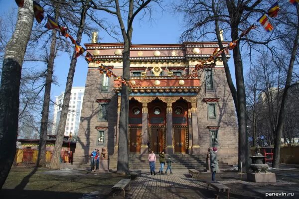 В 1900 году тибетский далай-лама подал ходатайство в Министерство иностранных дел России о строительстве буддийского храма в Петербурге. Идею строительства поддержали учёные-востоковеды и в 1909 году на участке, купленном бурятским ламой Агваном Доржиевым, началось строительство. Средства на строительство были пожертвованы Доржиевым и XIII далай-ламой и собраны среди верующих Бурятии и Калмыкии. Северный фасад. Архитектор Гавриил Васильевич Барановский спроектировал храм в соответствии с канонами тибетской архитектуры и в популярном в те годы стиле северного модерна. За образец был взят тибетский соборный храм («цогчен-дуган»). Ворота дацана со стороны Приморского проспекта. Главные ворота почти всегда закрыты, вход на территорию со стороны ст. м. Старая Деревня. Мемориальные таблички настоятелям храма и верующим, репрессированным в 1930-е годы. Верующим и учёным-востоковедам были предъявлены обвинения в шпионской деятельности в интересах милитаристской Японии. В 1938 году храм был зак