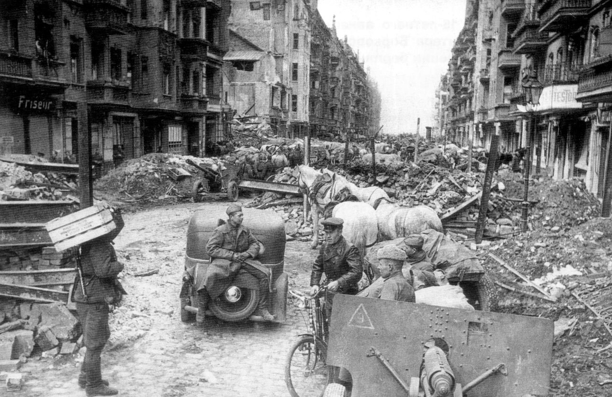 Советские солдаты в Берлине по окончанию боев. Май 1945 года.На переднем плане и позади, за автомобилем — 76-мм орудия ЗиС-3 образца 1943 года. Советская 152-мм гаубица МЛ-20 на улице Берлина, май 1945 года Пленные немецкие солдаты идут мимо советских танка Т-34-85 и САУ. Берлин, май 1945 года. Мария Тимофеевна Шальнева (Ненахова), ефрейтор 87-го отдельного дорожно-эксплуатационного батальона, регулирует движение недалеко от рейхстага. Берлин. 2 мая 1945 года. Советский танк Т-34-85 из 7-го гвардейского танкового корпуса и пленные ополченцы из фольксштурма на улицах Берлина, май 1945 года. Взятый в плен начальник медслужбы полиции Берлина, генерал-майор медслужбы Карл Эмиль Вробель (Karl Emil Wrobrl). Берлин, 2 мая 1945 года. Утром 2 мая 1945 сдался вместе со штабом 56-го танкового корпуса и командующим обороной Берлина, генералом Г. Вейдлингом. 2 мая 1945 года. Командующий обороной Берлина генерал артиллерии вермахта Гельмут Вейдлинг (Helmuth Weidling, 1891-1955) выходит из бункера во