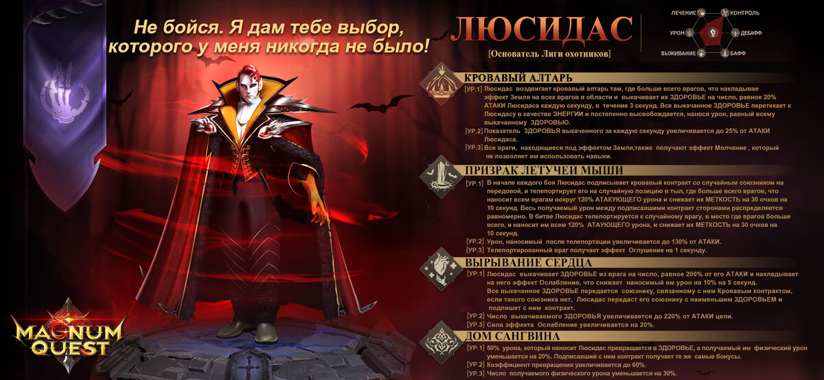 Помните нашего таинственного героя/главного героя любовной истории/ вампира, Люсидаса? Извините за его опоздание, мы надеемся, что вы оцените и поймете, что он того стоит! Бессмертный вампир по имени Люсидас живет с незапамятных времен. Он является главой Лиги охотников, которую основал вместе с Хильдой, своей женой. Все знают его как таинственного хозяина замка, в котором находится самый красивый в мире сад, и комната, в которую никому не дозволено входить. Интересно, секретная комната имеет какое-то отношение к Хильде? Не забудьте проверить её!