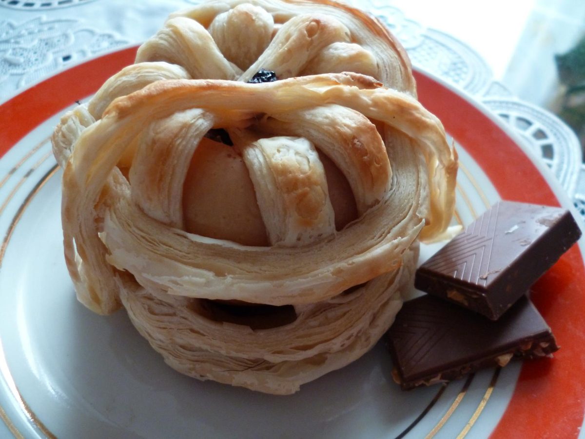 Ингредиенты:яблоки- по количеству гостей;остальные ингредиенты в расчете на яблоко: шоколад- 2 квадратика ;ягода( любая)- 1 столовая ложка; тесто слоеное- 200 г; растительное масло.