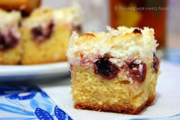 Обалденный пирог! Очень сочный, очень ароматный, в меру сладкий, с восхитительной кокосовой «шапочкой». Готовить пирог проще простого, продукты все незамысловатые. Непременно попробуйте, я уверена, что Вы просто влюбитесь в эту душевную и такую домашнюю выпечку! Вам потребуется: Для теста: 3 яйца, 100гр. сливочного масла или маргарина, ¾ ст. сахара, 150гр. сметаны, 1п. разрыхлителя (10гр.), щепотка соли, ~ 200гр. муки. Для начинки: 1б. вишневого компота (у меня банка 580мл.), 2ст.л кокосовой стружки. Для кокосовой глазури: 300гр. сметаны, ¾ ст. сахара, 1ст. кокосовой стружки, ванилин. Как готовить: 1. Вишню откинуть на сито, и дать хорошо стечь жидкости. Если ягоды с косточками, убрать их. 2. Для теста соединить яйца, размягченное сливочное масло и сахар. Перемешать с помощью миксера. Добавить сметану, разрыхлитель. Взбить. Затем добавить просеянную муку. Муки может потребоваться чуть меньше. Тщательно перемешать. При желании, можно опять взбить миксером. Тесто должно быть густое, но л
