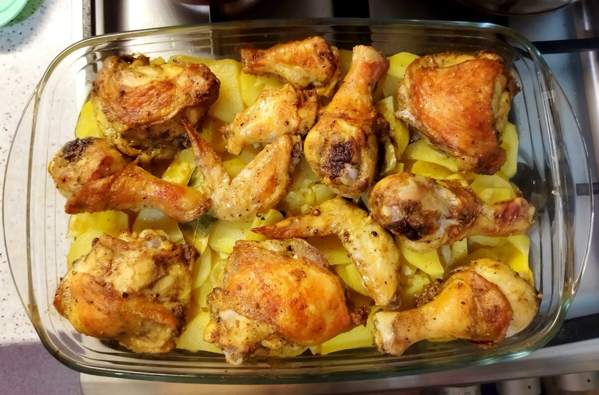 Проще ну просто некуда, а вкусно. Тот случай когда мудрить ничего не нужно: куриные части, картофель, чеснок, пряности. А вот в результате получается вкусно, ароматно и сытно. Время активного приготовления 30 минут. Ингредиенты: Куриные части — 1,3 кг Картофель — 1,3 кг Чеснок — 3 зубчика Карри — 2 ч. ложки Мускат — 1 ч. ложка Пажитник — 1 ч. ложка Смесь перцев — 2 ч. ложки Лавровый лист — 2 шт. Масло растительное — 2 ст. ложки. Соль — по вкусу Процесс приготовления. Куриные части (у меня 4 бедра, 4 голени, 2 крыла) положите в глубокую посуду и посолите. Добавьте смесь перцев, карри, мускат и пажитник. Перемешайте и оставьте мариноваться 2 часа. Картофель очистите от кожицы, помойте, нарежьте кружками и полукружками толщиной примерно 0,5 см. Смажьте форму для запекания растительным маслом и разложите в ней картофель. Каждый слой солите и перчите по вкусу. Нарежьте чеснок мелко и выложите на картофель. Положите также два лавровых листа. Затем выложите на картофель куриные части и