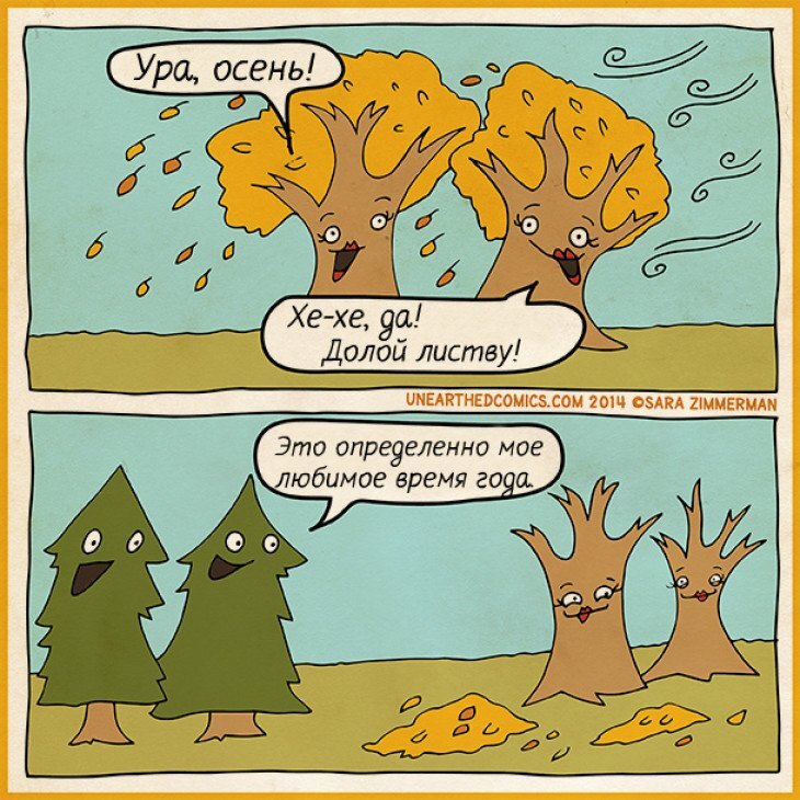 Привет, дорогой друг! Немного грустно это признавать, однако, лето почти подошло к концу. Осталось буквально два дня, после которых на календаре начнет царствовать осень. Прежде чем ты начнешь чувствовать, что развивается хандра, я тебя остановлю — сегодня будет подборка уютных комиксов про эту замечательную пору. Я собрал #комиксы от разных авторов, которые поднимут тебе настроение и помогут пройти 5 стадий принятия неизбежного (осенней погоды) гораздо быстрее. К тому же они помогут вспомнить, а что же такое осень в принципе. Пока что в большей части городов России деревья стоят в пышной зеленой листве, но уже скоро зелени станет меньше, а листья окажутся на земле. Художница Сара Циммерман заметила, что для нас листья — это всего лишь листья, а вот для деревьев настоящая одежда. Им с ней расставаться может быть не совсем уютно. Кстати, далеко не всегда #осень — это что-то промозглое и сырое, бывают дни, когда стоит приятная или даже жаркая #погода . Если ты уже достал весь свой осенни