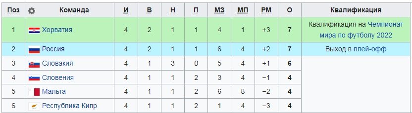 После четырех туров отборочную группу "Н" возглавляет сборная Хорватии, у которой 7 очков. На втором месте сборная России, которая тоже имеет 7 очков, но немного уступает хорватам в разнице забитых и пропущенных мячей. На третьем месте находится Словакия. В активе этой сборной 6 очков. Словакия остается единственной командой в нашей группе, которая пока что не потерпела ни одного поражения. По 4 очка набрали Словения, Мальта и Кипр. Турнирная таблица группы "Н" после 4-х туров: При равенстве очков сразу у нескольких команд выше в таблице находятся те, у кого лучшая разница забитых и пропущенных мячей. Изначально Кипр и Мальта считались аутсайдерами группы "Н", однако после 4-го тура обе сборные отстают от лидера группы всего на 3 очка. В остальных отборочных группах есть сборные, которые пока что вообще не набрали ни одного очка. И только в нашей группе даже команда, занимающая последнее место, имеет 4 очка. Группа "Н" пока выглядит очень ровной. Календарь ближайших матчей 5-й тур (4
