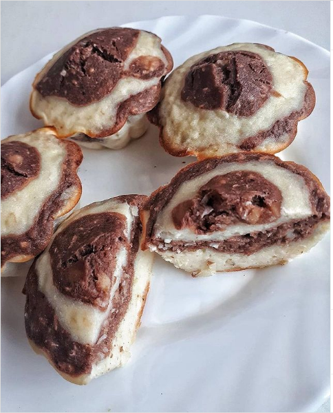 Банан разминаем вилкой, добавляем яйцо, муку, мягкий творог, разрыхлитель, подсластитель, все перемешиваем. Разделяем полученное тесто на две части. В одну добавляем какао, кокосовую стружку, перемешиваем. Берём форму и укладываем слоями, темное тесто-белое-темное. Ставим в микроволновку на 3-5 минут при 800 Вт, либо в духовку , разогретую до 180 градусов на 25 минут