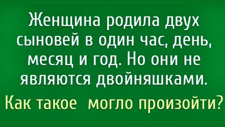 Загвоздка логической задачи в том, что, решая эту задачу, нельзя зацикливаться на стандартном решении, надо мыслить оригинально, более логически. Далеко не все люди думают нестандартно, необычно, многие не как не могут решить логическую задачку, лишь из-за того, что думают столь очевидно, просто, несмотря на другие варианты ответов, решений... Так давайте приступим в конце концов! Перед нами две простые, НО ЛОГИЧЕСКИЕ задачи: Задача 1: Ответ:\ * * * * * * * * * * Дети оказались тройняшками.... Задача 2: Антоний и Клеопатра были найдены на полу мёртвыми, вокруг валялись кусочки битого стекла, единственным свидетелем их смерти была собака. Известно, что Антоний и Клеопатра умерли не от отравления, и на их телах не было следов насильственной смерти. Так как же они погибли? Ответ % \ \ \ \ \ \ _ _ _ _ _ _ _ _ _ & & @ :^) :-) Антоний и Клеопатра - рыбки, собака разбила их аквариум. И напоследок ещё о