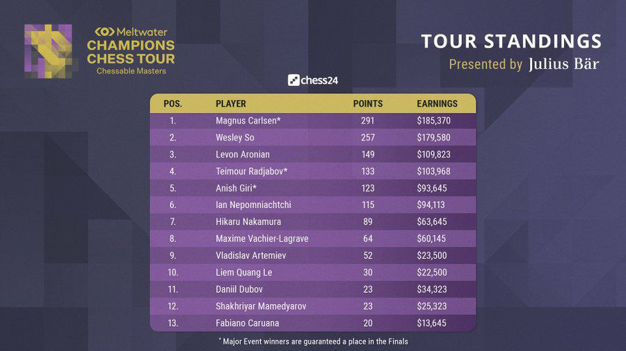 28 августа начался последний перед Гранд-финалом онлайн-турнир серии Chess Champions Tour. Напомним, что победитель всей серии определится в живом турнире, который, вероятнее всего, пройдет в Осло осенью. На данный момент общий зачет выглядит следующим образом. Карлсен, Раджабов и Гири гарантированно примут участие в гранд-финале как победители мейджоров. Состав участников AimChess US Rapid: Уже в традицию вошло поражение Магнуса Карлсена от Алирезы Фируджи на групповом этапе онлайн-турниров. Данное мероприятие не сталом исключением и норвежец вновь уступил 18-летнему гроссмейстеру. Главной ошибкой Магнуса стал ход 31..Кре4, после которого белые включают мельницу и постоянными шахами загоняют черного короля под мат. Вот, как это было: Похоже, что чемпион мира даже не заметил мат в один ход в этой позиции. Реакция Карлсена: Карлсен мог избежать поражения, если бы в критический момент задвинул пешку на е2: Это поражение стало для Магнуса единственным за весь игровой день, поскольку он и