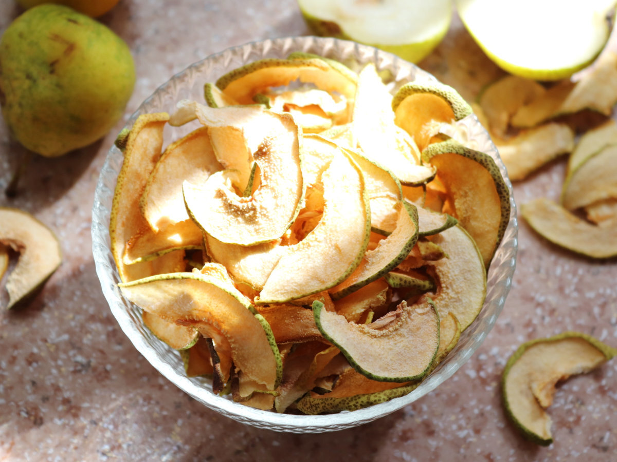 Замачивание в кислой воде позволит кусочкам груш не потемнеть при сушке. 3. Груши разрезать пополам, вырезать семенную коробочку и нарезать ломтиками толщиной 2-3 мм. 4. Опустить ломтики груш в подкислённую воду буквально на 20-30 секунд. Вытащить ломтики груш и обсушить, разложив на бумажном или х/б полотенце. 5. Разложить ломтики груш на формах электросушилки в один слой. 6. Сушить груши, ориентируясь на технические характери