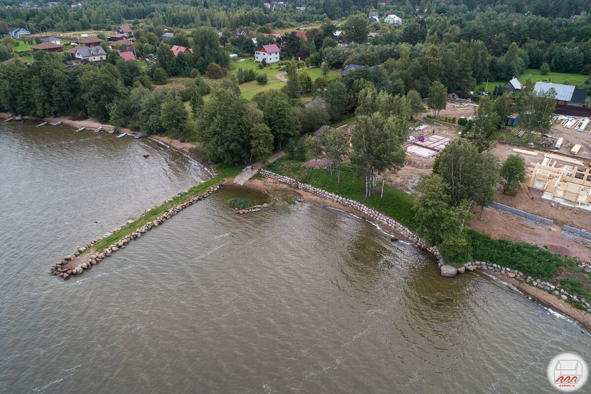 Строим УШП – утеплённую шведскую плиту для дома из клееного бруса 200*280 на берегу залива: Берег самый натуральный, так называемая "первая линия", можем дружно позавидовать владельцу участка – классное место, хоть и довольно далеко от Санкт-Петербурга (больше фото с коптера смотрите в этой галерее). Населённый пункт называется Прибылово: На момент съёмки почти всё уже готово к заливке плиты: Наибольший интерес, пожалуй, представляет полуметровая "ступенька" посреди фундамента: К сожалению, я не обладаю красочными планировками или рендерами, но из КД, для общего понимания, можно выдернуть один фасад: В более низкой части дома будет просторная кухня-гостиная площадью более 50 квадратных метров. С хорошим видом конечно: На момент съёмки опалубка для "ступеньки" ещё не сделана, так что хорошо видно саму конструкцию: На чертежах данный узел выглядит так: Сваи для будущей террасы ещё не обрезаны: На фотографиях видно шпильки-закладные для крепления обвязок террасы, вот крупный план: При по