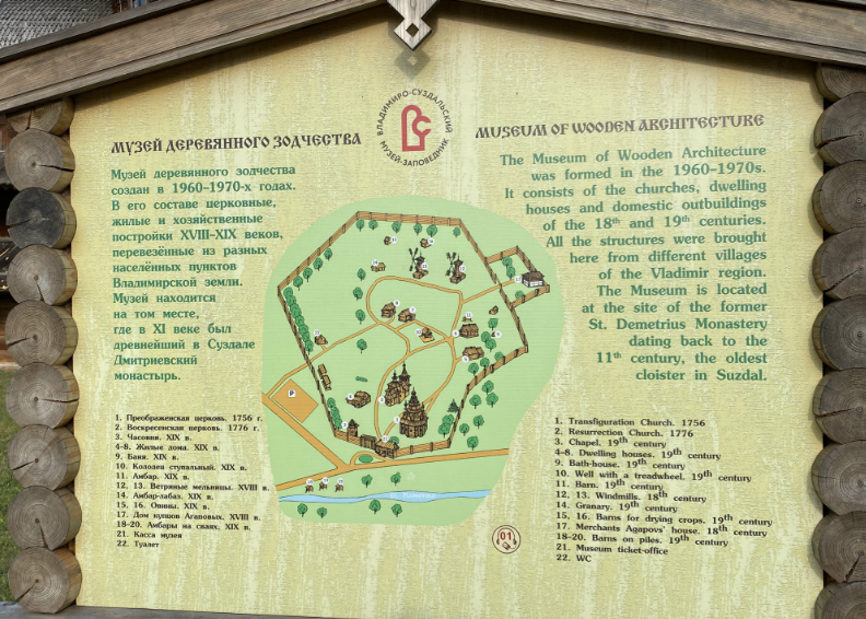 Экспонаты для этого музея под открытым небом собирались по всей Владимирской области. 18 памятников деревянного зодчества XVIII-XIX вв., построенные русскими мастерами-плотниками практически только топором, занимают площадь 3,5 га на высоком живописном берегу р. Каменки. Постройки были перемещены в Суздаль в целях сохранения и показа туристам в 60-70-ые годы прошлого столетия. В музее воссоздана планировка небольшого села Владимирской губернии: на высоком месте два храма и часовня, от которых идет сельская улица с жилыми крестьянскими домами, хозяйственными постройками. В одном из храмов и в домах представлены сельские интерьеры и тематические выставки. Тут можно увидеть интересные старинные предметы обыденной жизни русских крестьян.