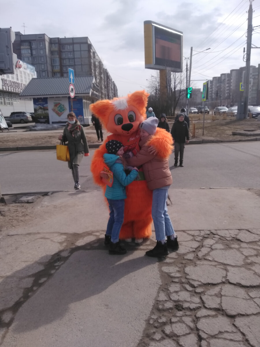 Отлично помню этот день. Апрель. Весна. Выходной. Город такой серый и унылый. И по городу ходил этот лис. Он ничего не раздавал, а просто гулял. Он был такой позитивный, весёлый. Танцевал на каждом светофоре и со всеми обнимался. От него просто бомбило энергией и хорошим настроением. Мы шли по другой стороне улицы, и я всё искала момент, что бы перейти дорогу и встретиться с ним. Но он свернул и пропал. Прошло пара часов и по дороге домой мы его встретили снова, на пешеходнике. Я была в таком восторге! Этот момент просто не передать, когда увидели его снова и обнялись. От благодарности переполняло и от радости хотелось плакать. Такие моменты в жизни очень редки. Кажется, что за ерунда, но в тот момент ты начинаешь осознавать всю прелесть жизни. Мысли проносятся быстро и инсайты приходят с космической скоростью. Обычный студент в костюме, так радуется жизни - а что тебе мешает? Обычная серость вокруг, но сколько всего интересного можно встретить. Обычный выходной, но может п