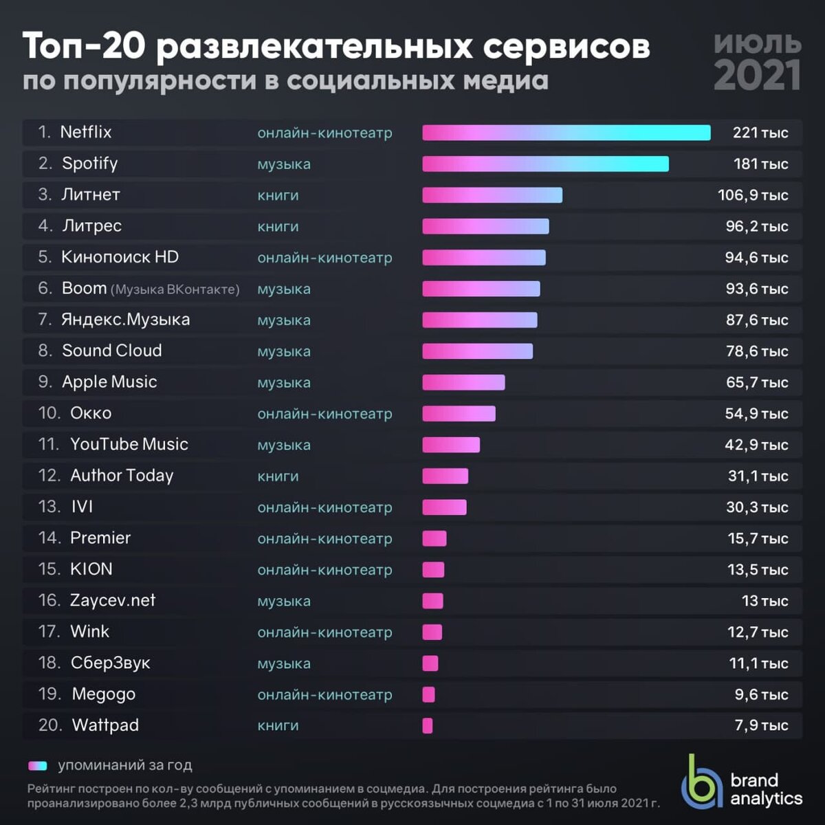 219/365 Я обожаю Brand Analytics за всё что они делают. В очередной раз ребята решили поделится статистикой самых популярных цифровых сервисов для развлечений. Очень воодушевляет что в числе первой пятерки среди всех видов развлечений в рунете два сервиса с литературой. Нетфликс и спотифай конечно на голову всех опережают. По книжним сервисам отдельно никаких сюрпризов нет, две самые известные библиотеки занимают первые две строчки. Остальные почти никому не известны. Спотифай на первом месте среди музыкальных сервисов, на втором месте ненавистный мне Вконтакте, далее Яндекс.Музыка на которую я подписан благодаря колонке Алиса. А еще я подписан на YouTube Music как на основной плеер с телефона. Его подборки и рекомендательная лента шикарна. Подборка кинотеатров шикарна, на верхние 4 сервиса я подписан уже более года стабильно, иногда бываю подписан на премьер. Все остальные сервисы не вызывают во мне никакого интереса. Только IVI я бы поставил повыше, сразу под нетфликсом, но как