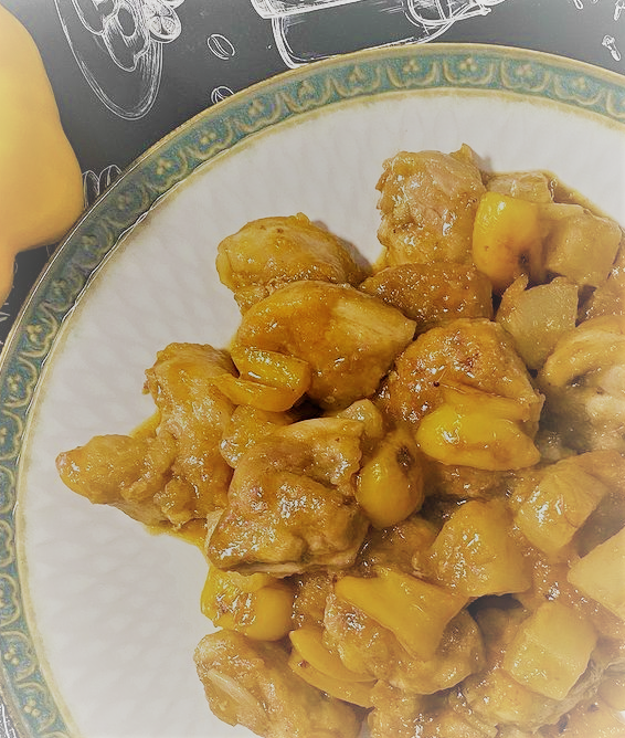 Курицу режем крупными кусочками, складываем в пакет, добавляем крахмал и хорошенько встряхиваем, так чтобы все кусочки были в крахмале. Крупно режем перец, мелко шинкуем имбирь и чеснок. На раскалённом масле обжариваем кусочки курицы до золотистой корочки и перекладываем на тарелку. Быстро обжариваем перец. Возвращаем в сковороду курицу, добавляем чеснок, имбирь, перемешиваем и жарим все вместе 1 минуту. Добавляем соевый соус, кетчуп и ананасы с сиропом. Сиропа я добавила при