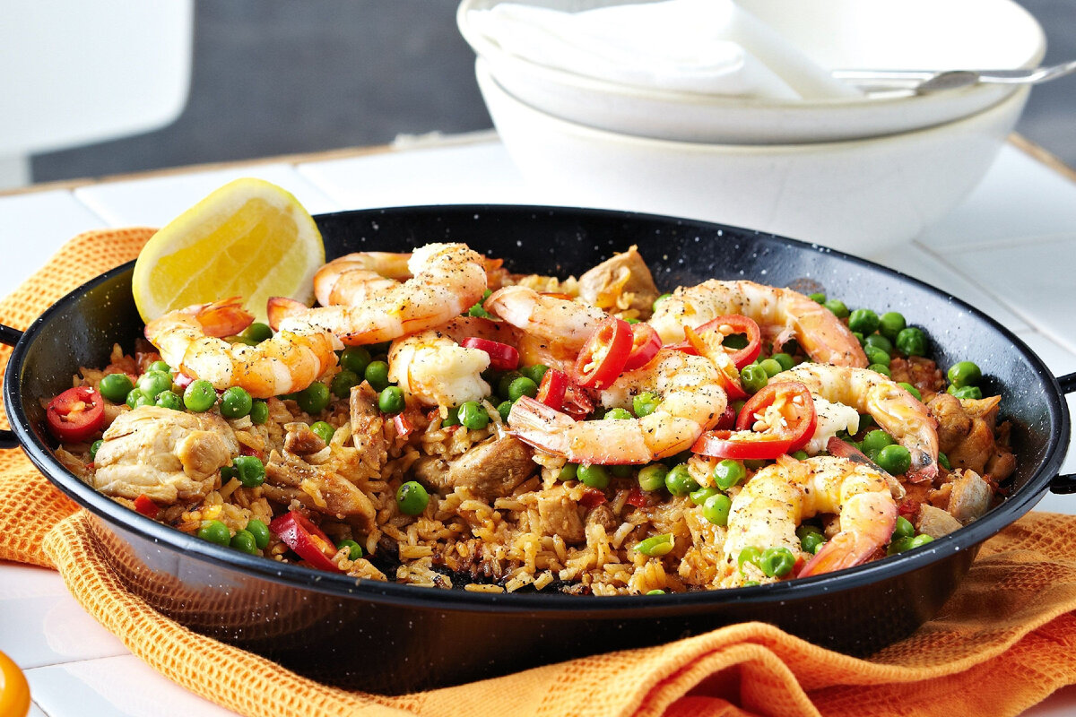 Это классическое испанское блюдо, название которого правильнее будет произносить как «паэйя». Основной ингредиент паэльи — рис. Вместо необходимого в рецепте шафрана, кайенского перца и паприки по отдельности, можно использовать готовую смесь пряностей для паэльи. Сочетание мяса с рыбой или курицы с креветками — традиционно для Испании. Если оно вам не по вкусу, готовьте просто паэлью с курицей или паэлью с креветками, соответственно увеличив их количество. А я предлагаю вам рецепт паэльи с курицей и креветками.