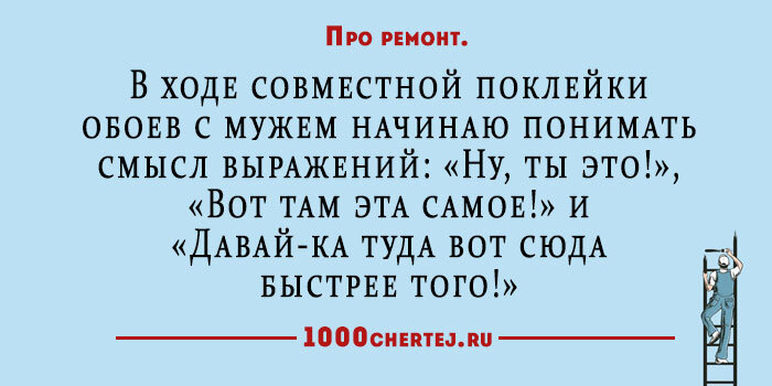 - Пап, нам задали написать сочинение о родителях. Как лучше написать: "Папа много работает" или "Папа много зарабатывает"? - Пиши, как хочешь, но обязательно добавь: "На ремонт класса, он денег больше не даст!". *** Да здравствует кризис! У соседей кончились деньги на ремонт!!! Затихли дрели и перфораторы! *** - Дети, не забудьте завтра принести в школу деньги. - А с карточки заплатить можно? - Нет, только налом. - Коррупция, Марья Ивановна. - Нет,дети, ремонт. *** В России оплаченная квитанция дорожного налога должна приравниваться к полису КАСКО на ремонт подвески без ограничений. *** Мастер из автосервиса звонит клиенту домой. - Здравствуйте, ваша жена приехала в наш автосервис... - Да-да, я знаю, я оплачу ремонт ее автомобиля. - Да, ремонт ее автомобиля вы оплатите. А кто будет платить за ремонт автосервиса? *** Пошел в банк и сообщил им, что согласно проведенному вчера в моей семье референдуму, мы с женой отказываемся возвращать кредиты на ремонт. *** Когда соседи