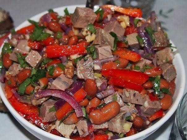 Ингредиенты: ● 1 банка красной фасоли ● 200-250 грамм отварной говядины ● 1 средняя красная луковица ● 1 красный болгарский перец ● половинка острого перца ● 2-3 зубчика чеснока ● 50 грамм грецких орехов ● средний пучок кинзы ● молотый черный перец Для заправки: ● оливковое масло и винный уксус Приготовление: 1.Лук режем тонкими полукольцами. Если лук "домашний" - сочный и острый, то лучше его порезать и опустить на 2 минуты в горячую воду, иначе вкус лука забьет всё остальное в салате. 2.Из болгарского перца удаляем семена и режем соломкой. 3.Мясо режем кубиками. Из острого перца также аккуратно удаляем семена и мелко-мелко рубим. 4.Чеснок можно порубить или пропустить через чеснокодавилку. 5.Из банки фасоли сливаем воду и промываем её. 6.Добавляем лук, говядину, перцы, чеснок, порезанную кинзу, обжаренные и мелко порубленные грецкие орехи. 7.Солим, добавляем черный перец - по вкусу. 8.Заправку делаем из 4-5 столовых ложек оливкового масла и 1 столовой ложки винного уксуса. 9.За