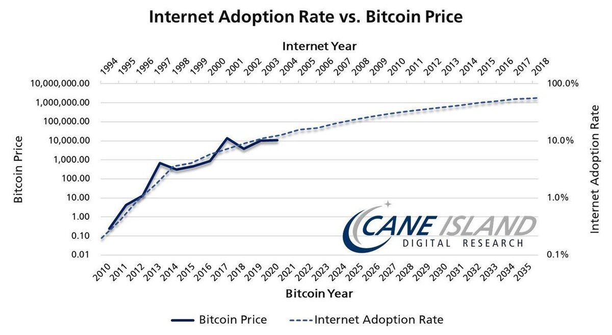 Биткоин все еще находится на ранней стадии принятия. В настоящее время менее 2% мира используют топовую криптовалюту, всего около 130 миллионов человек. Текущая модель роста биткоина ставит его в один ряд с темпами роста интернета в 1997 году. Еще в 1997 году интернет насчитывал ~ 130 миллионов пользователей. Сам Интернет был создан в 1983 году, но не получил широкого распространения до 1990-х годов. Люди очень долго отвергали данную технологию и считали, что вскоре она исчезнет. К 1997 году только около 1,7% населения мира фактически использовали интернет. Точно так же, как биткоин в 2021 году. Год спустя число пользователей интернета удвоилось. К 2000 году население мира, пользующееся интернетом превысило 5%. На тот момент общее количество пользователей превысило 350 миллионов. С того момента до 2005 года количество пользователей интернетом достигло 1 миллиарда. Биткоин демонстрирует такое же движение, как и распространение интернета. В сроках есть незначительные отклонения.
