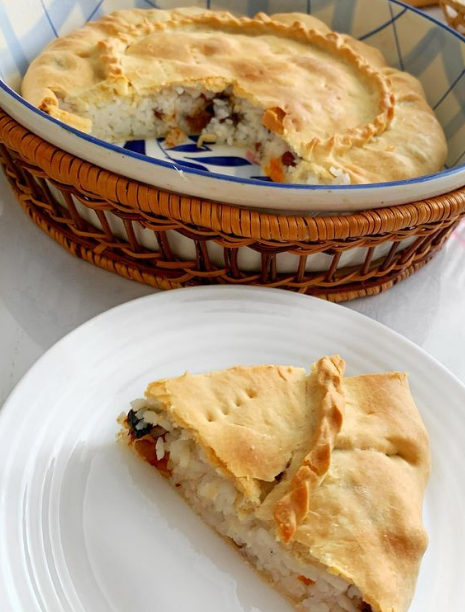 Замешиваем мягкое тесто,даём отдохнуть пока делаем начинку. Промываем изюм,чернослив и курагу, нарезаем соломкой, добавляем рис, сахар,соль и перемешиваем. Разделяем тесто на две неравные части и раскатываем в круг.