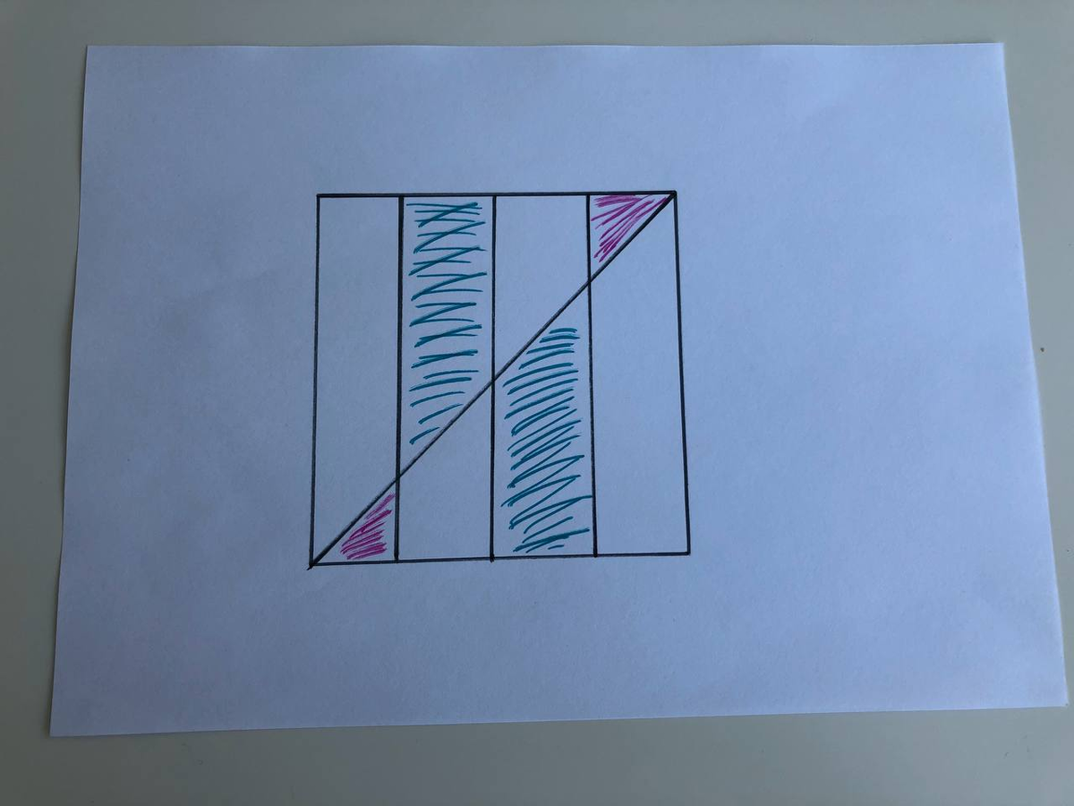 Сегодня мы с вами будем решать довольно интересную задачу, которая при первом взгляде кажется абсолютно не решаемой. Вы на канале "Всё просто", где мы вспоминаем арифметику и геометрию, пользуемся логикой и делимся математическими лайфхаками. Итак, дано: квадрат, разделенный диагональю на две равные половины и еще тремя вертикальными линиями на четыре полоски. Некоторые части получившихся прямоугольников выше и ниже диагонали заштрихованы красным и синим. Выглядит это вот так: Пока - ничего сложного. Но вопрос кажется очень странным и звучит он так: какую часть от квадрата занимают заштрихованные фигуры? Причем отдельно синего и красного цвета. Решение кажется не понятным на первый и даже на второй взгляд: потому что фигуры все неправильные, не известна площадь первоначального квадрата, да и вообще ничего не известно. А даны лишь квадрат и его диагональ. Посмотрите на рисунок внимательнее, вниз пока не перематывайте и подумайте, как же можно решить эту задачу? Получилось? А теперь я