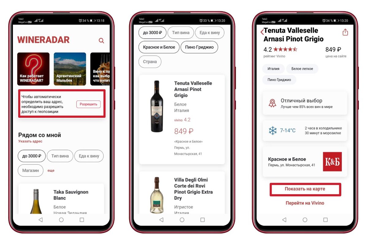 🍇 Как найти любимое вино поблизости Мы уже рассказывали, как найти вино, которое точно понравится. Теперь — как найти его недалеко от себя с помощью приложения "WineRadar". Приложение анализирует наличие вина в алкомаркетах, пишет цену и выстраивает маршрут до магазина. Как им пользоваться: 1. Скачиваем приложение из PlayMarket или AppStore. Ссылка PlayMarket https://play.google.com/store/apps/details?id=com.wineradar.app Ссылка AppStore https://apps.apple.com/ru/app/wineradar/id1545812738 2. Открываем его, включаем геолокацию и разрешаем доступ к местоположению. 3. Настраиваем фильтры: магазин, виноград, страна, цена, тип вина и к какой еде. 4. Сравниваем цены и вина, затем нажимаем на понравившийся вариант и кликаем "Указать на карте". В приложении также есть интересные статьи о вине: от сортов вина до объяснения значков и слов на бутылках.