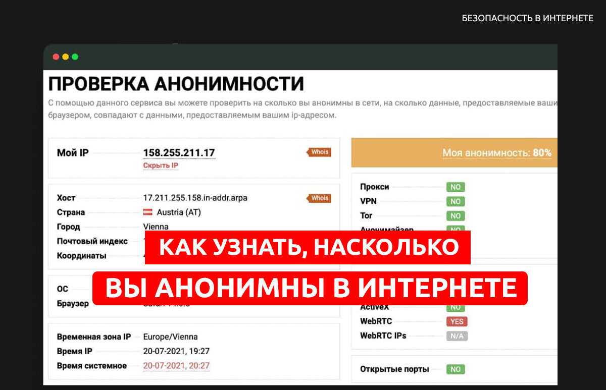 Как узнать, насколько вы анонимны в Интернете. Все сайты, которые вы посещаете, видят ваш адрес, IP и название провайдера. Но если вы заботитесь о своей анонимности, то наверняка используете VPN или Tor, чтобы сайты не узнали ваши настоящие данные. Иногда они сбоят: например, VPN или прокси перестают работать — и показывают ваш реальный IP. Чтобы обезопасить себя от этого, используйте сервис Proxy6. Он собирает и проверяет все ваши данные, а через несколько секунд показывает результаты проверки. Вы узнаете, как выглядит ваш условный профиль в Интернете — включён ли VPN, прокси, Tor, режим Turbo и двусторонний пинг. А также Proxy6 проверит вас в базах утечек: например, слит ли ваш DNS, IP-адрес через WebRTC и другие данные.