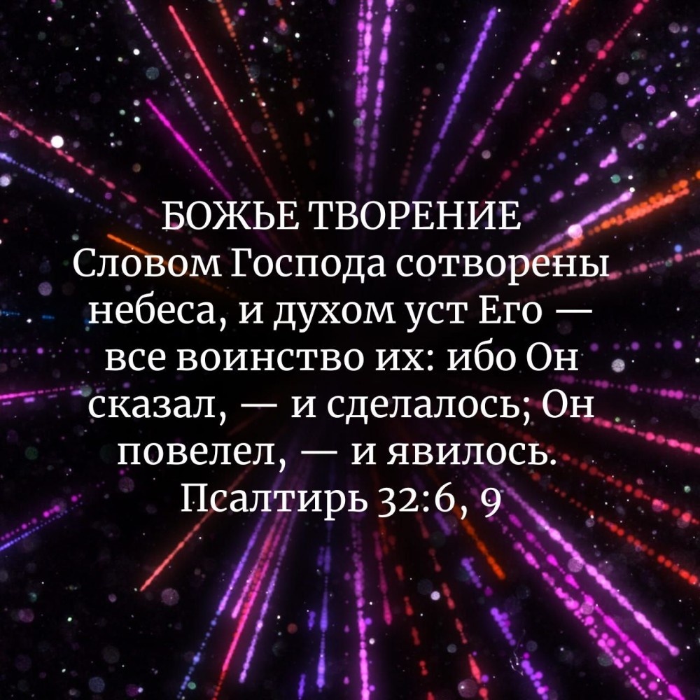 «Словом Господа сотворены небеса, и духом уст Его - все воинство их. Он собрал, будто груды, морские воды, положил бездны в хранилищах. Да боится Господа вся земля... ибо Он сказал, - и сделалось; Он повелел, - и явилось» (ст. 6-9).