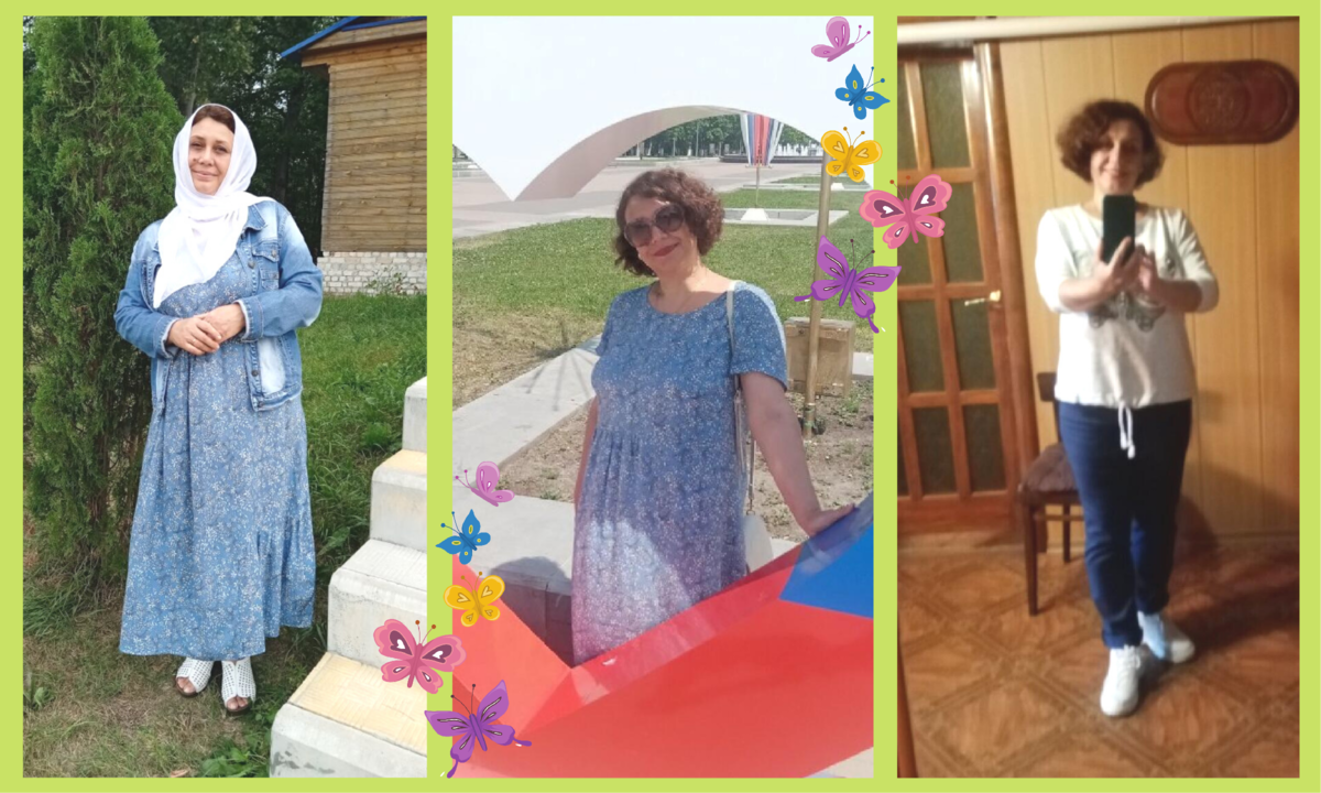 - На первом фото у Оли 87 кг и это август 2020 года. На втором фото - июнь 2021 года, минус 10 кг. Платье, - Оля пишет, -то же самое, что и на первом фото, болтается, сейчас уже его ушила. И дата последнего фото - это август 2021 года, и вес уже 75 кг!