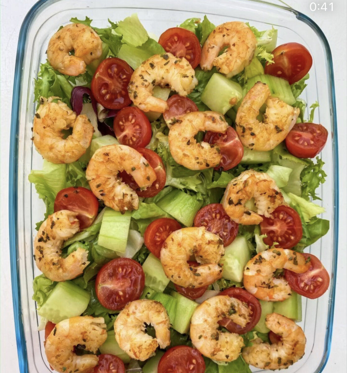 Легкий и полезный салат с креветками! Ингредиенты: Листья салата , руккола Огурец Помидоры Черри Креветки Лимонный сок Оливковое масло Соль и специи (у меня орегано) Приготовление : Креветки обжарить на оливковом масле со специями , посолить немного . На дно тарелки выложить зелень , потом разложить овощи : огурец и помидоры, в конце - креветки. Все родить лимонным соком и оливковым маслом ! Это очень вкусно и полезно ! Приятного аппетита 😋 Рецепт с ♥️ от Насти