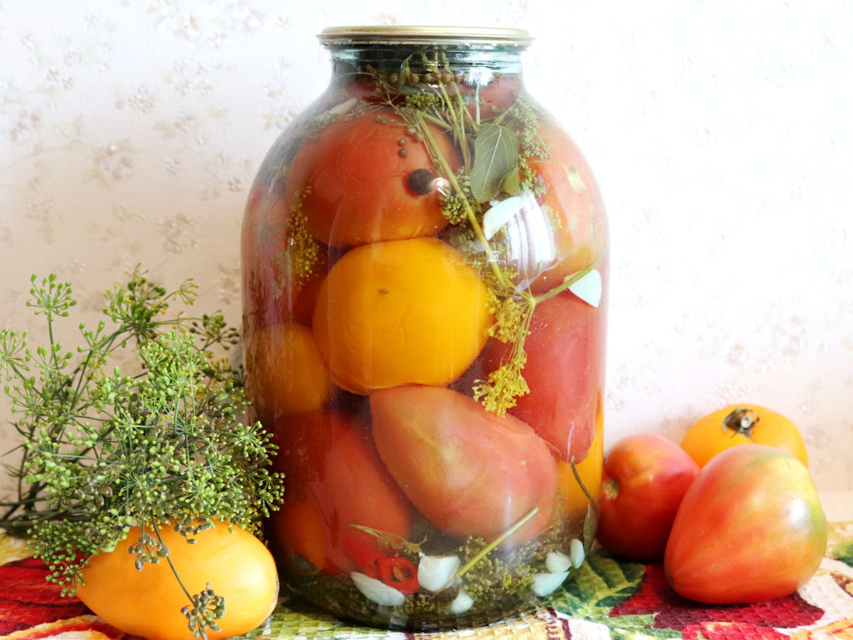 Расход продуктов указан на трехлитровую банку. Специи можно взять по своему вкусу. 2. Помидоры тщательно помыть и наколоть место плодоножки зубочисткой, но это не обязательно. Бытует мнение, что это позволяет помидорам не лопаться, хотя, на мой взгляд, это спорное заявление. 3. На дно чистой банки положить ароматную зелень и специи. 4. Заполнить банку помидорами поплотней. Лучше выбирать небольшие и плотные помидоры. 5. Залить банку с помидорами горячей водой. Я кипячу воду в чайнике и сразу заливаю в банку. Оставить банку на 20-30 минут, прикрыв крышкой. 6. Слить рассол в кастрюлю, до