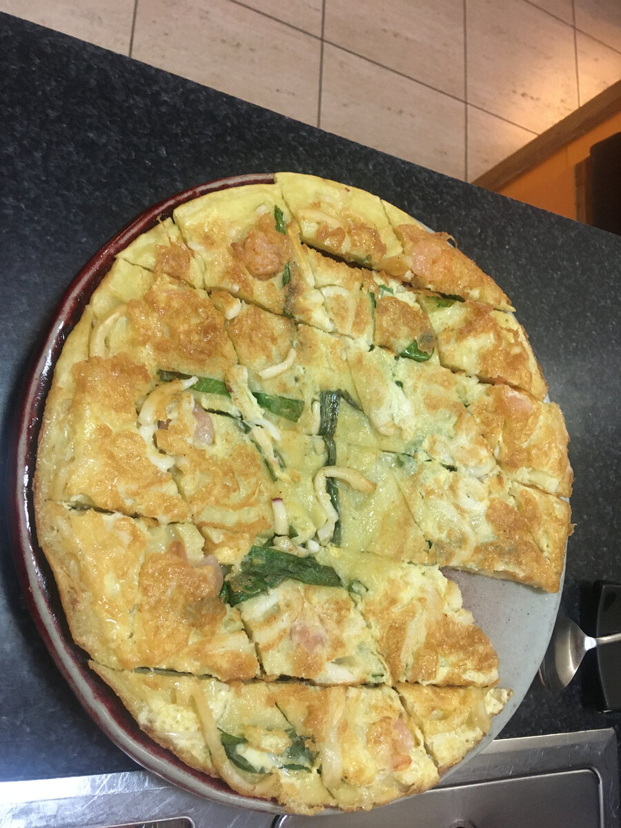Наши корейские соседи по Сахалину используют все возможности, чтобы добавить в еду морепродукты. Не стал исключением и традиционный корейский пачжон - блин с зелёным луком. У него есть разновидность "хемуль пачжон", для приготовления которого используют морепродукты. Основа пачжона больше похожа на наш омлет - по крайней мере, по вкусу. А по размеру и форме - на пиццу. Для основы блюда замешивают воду, муку, яйцо, соль и перец. Потом моют лук и нарезают на небольшие кусочки в три-четыре сантиметра. Морепродукты можно добавлять какие угодно (разумеется, очищенные) - кальмары, гребешки, мясо краба, креветки, осьминожку - всё, что море подарит. Всё это замешивается с тестом и луком, кладётся на сковородку и обжаривается с двух сторон. Получается очень сытное блюдо, с которым в одиночку справиться проблематично. Хемуль пачжон можно есть с любыми соусами. Кто-то ограничивается простым соевым из магазина. Кто-то заморачивается и готовит свой. Кто-то вообще горчицу добавляет. На вкус и цвет,