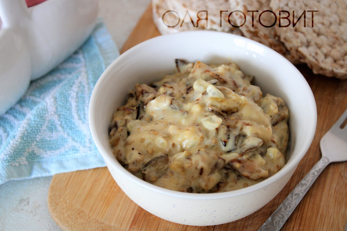 И снова рецепт с моими любимыми баклажанами, на этот раз не салат и не горячее. Закуска-намазка, которая хорошо как в холодном так и в теплом виде. Ее можно намазать на хлеб и есть как бутерброд, а можно подавать и как закуску к основному блюду. Итак, все предельно просто. Баклажаны я очищаю от кожицы и нарезаю небольшими кубиками. Выкладываю на противень, посыпаю соль, перцем и смазываю растительным маслом с помощью силиконовой кисточки. Отправляю запекаться в духовке при температуре 180 градусов около 30 минут. Пока баклажаны находятся в духовке я обжариваю лук на растительном масле до готовности, когда лук будет полностью готов добавляю пару зубчиков чеснока. К этому моменту баклажаны уже готовы, я отправляю их с противня на сковороду и сразу же добавляю сливочный плавленый сыр. Все хорошо перемешиваю. Сыр с баклажанами должен полностью прогреться, но не закипеть. Есть закуску можно сразу, а можно и подождать