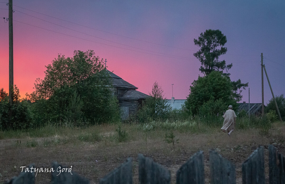 Эта старая дама идёт из гостей домой. В деревне вместе с нами, 5 человек. Путь её лежит к новому дому, мимо её же дома старого. Снимок получился таким щемящим душу, как -будто от нас уходит что-то родное, и уходит навсегда... Мимо этой разрушившейся избы. Мимо сгоревшей бани... Мимо этого, павшего от времени дома. А это крыльцо её дома, старого. В нескольких метрах от нового аккуратного домика,где она живёт каждое лето. Попадая в такие дома, у меня всегда возникает ощущение беззащитной неприкаянности вещей от времени. Эти остатки занавесок, что колыхались от ветра, при открытых летним днём окнах. Теперь тоже ветер залетает сюда, на правах хозяина, и рвёт эти кисейные остатки на части. На остатках печки, что разобрана для нового дома - хозяйский бушлат, аж с Черноморского флота, единой и нерушимой когда-то страны. На чердак уже не попасть, и лестницы нет, и старые брёвна перекрытий сгнили. Во вторую комнату тоже не очень хочется идти - разруха и тлен. В красном углу, вместо икон - от