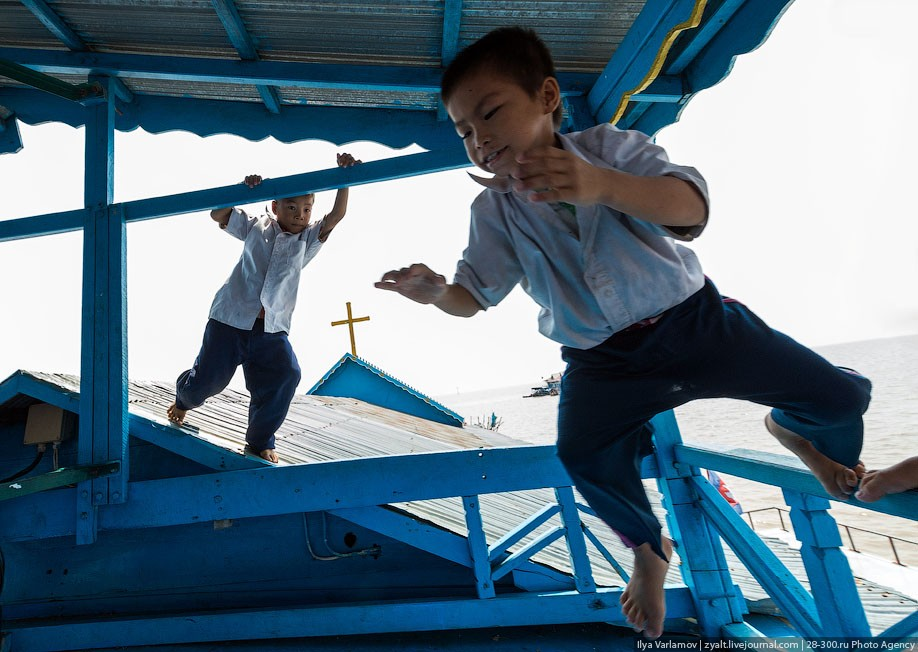 Озеро Тонлесап называют внутренним морем Камбоджи. Плавучих деревень там много. Это не просто понтонные дома, а целые сообщества на воде, со своими школами, полицейскими участками и даже храмами. С утра взял тук-тук и поехал. 01. Деревень на озере несколько, хотя обычно говорят только об одной, самой большой, где проживает более пяти тысяч человек и которая является популярным туристическим объектом. Туристический бизнес тут растет как на дрожжах. Всеми лодками заведуют китайские бизнесмены. Туристических лодок тут десятки. Все отработано до автоматизма: заплатил, сел, коротенькая экскурсия от гида, заехал в ресторан, заехал к попрошайкам, назад. Сейчас строится огромные терминал и туристический центр на берегу, делают дорогу, чтобы еще больше туристов могли любоваться плавучей деревней. 02. Домики. 03. По одной из версий, такие поселения массово возникли в середине прошлого века, когда в соседнем Вьетнаме началась война. Многие вьетнамцы были вынуждены покинуть родные места, а в благо