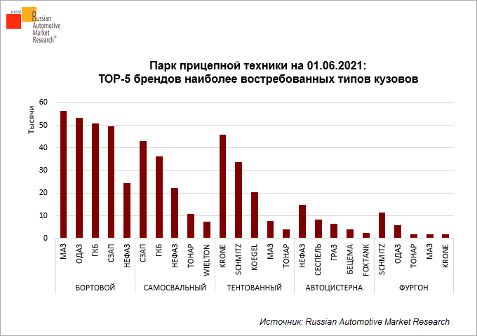 По данным Russian Automotive Market Research на 01.06.2021 года парк прицепной техники составляет 1,1 млн. ед. Самая востребованная прицепная техника (TOP-5 кузовов): бортовая, самосвальная, тентованная, автоцистерна и фургон. Они составляют 73,2% парка. Наиболее востребованным брендом среди бортовых прицепов стал МАЗ (56,4 тыс. ед.). СЗАП лидер парка прицепных самосвалов – 42,9 тыс. ед. На первом месте среди тентованных прицепов расположился бренд KRONE (45,9 тыс. ед.). НЕФАЗ возглавил ТОР-5 брендов прицепных автоцистерн (14,9 тыс. ед.). Бренд SCHMITZ занял первое место в парке прицепных фургонов. https://www.napinfo.ru/infographics/segmenty-rynka/lidery-v-parke-pritsepov Пожалуйста, оцените эту статью и подпишитесь на канал или поделитесь ссылкой на него в социальных сетях, если считаете его интересным.