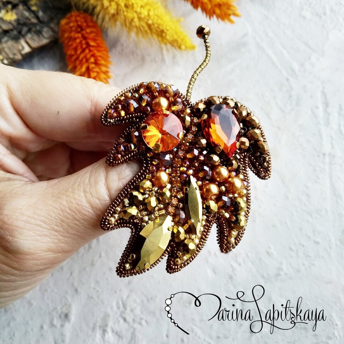 Серым – небо и лужи. А. Берлова Мы тоже можем помочь осени и раскрасить нашу одежду яркими брошками! Предлагаю мастер-класс по созданию броши "Осенний листик". Он подойдет и для начинающих мастеров. Брошью можно украсить шарф, снуд, пальто, жакет, свитер и даже шапочку. Для изготовления броши понадобятся: ▪️ фетр толщиной 1-1,5 мм, ▪️ акриловые краски по ткани, ▪️ канитель и трунцал коричневого цвета, ▪️ рондели 4 мм (золотого, бронзового, коричневого цветов), ▪️ стразы (капля 10х14 мм, риволи 8 мм, наветты 4х15 и 7х15), ▪️ стразовая цепочка 2 мм, ▪️ бисер коричневого и золотого цветов (№15 и 11), ▪️ пин 5 см под золото - 1 шт., ▪️ нитк