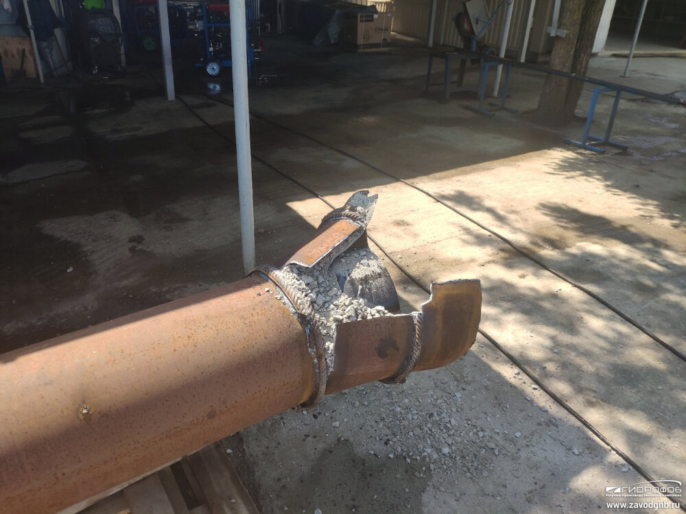 Сегодня проходило испытание тягового усилия трубного разрушителя ТР-2-200 при разрушении трубы ф219 мм, размещенной в футляре ф315 мм. Для создания больших усилий, пространство между трубами было залито бетоном, а лезвие ножа было срезано. Установка выдала заявленные 200 тонн, после чего был сделан небольшой надрез трубы, и на усилии 170 тонн началось разрушение трубы. Далее планируется подготовка плети 7-10 метров для испытания работы разрушителя при непрерывной длительной нагрузке.
