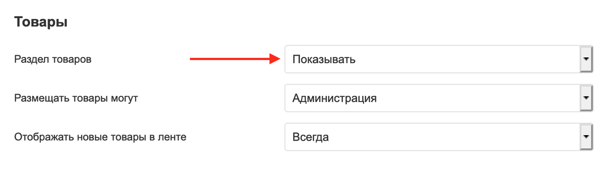 Превратить Одноклассники в канал продаж очень просто. В настройках страницы бизнеса откройте раздел «Управление». В блоке «Товары» выберите «Раздел товаров – Показывать».