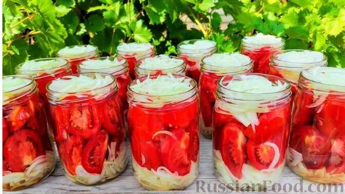 Продукты Помидоры - 4 кг Лук репчатый - 1 кг Для маринада, на 1 литр воды:Соль - 1 ст. ложка (с небольшой горкой)Сахар - 1,5 ст. ложки Уксус 9 % - 50 мл