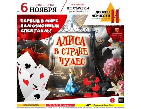 Хотите увидеть таинственную и захватывающую сказочную историю? В таком случае, стоит посетить “Алиса в стране чудес”, представляющий собой первый в мире иллюзионный спектакль, позволяющий совершить максимальное погружение в наполненную чудесами историю, рассказанную Льюисом Кэрроллом. В один прекрасный вечер девочка Алиса сталкивается с волшебным зеркалом и попадает в таинственный мир! Там она знакомится с Шляпником, который становится её проводником в мире чудес! Им предстоит пройти огонь и воду, причем как в прямом, так и в переносном смысле; познакомиться с большим количеством персонажей и даже сразиться с тёмной королевой! Наш иллюзионный спектакль, наполненный волшебством, подарит вам и вашему ребенку массу удовольствия и ярких впечатлений. Приходите – вам точно будет интересно! Подробности на сайте Дворца искусств Ленинградской Области: artlo.ru