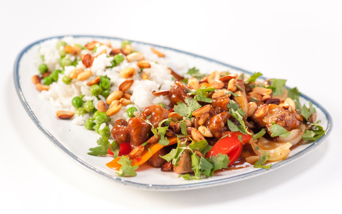 кинза Способ приготовления 1. Круглозёрный рис промываем, заливаем водой и отвариваем. Доводим до кипения, накрываем крышкой и уменьшаем нагрев. Вливаем кокосовое молоко, продолжаем варить. Добавляем зелёный горошек. 2. Морковь нарезаем ломтиками. Репчатый лук нарезаем на четвертинки. Болгарский перец и шампиньоны нарезаем произвольно. Мелко нарезаем имбирь и чеснок. 3. Нарезаем филе бедра индейки и отправляем в миску. Вливаем соевый соус, перемешиваем. Добавляем картофельный крахмал, ещё раз перемешиваем, даём постоять. Добавляем ещё крахмала и вновь перемешиваем. 4. Кусочки индейки обжариваем во фритюре и выкладываем на салфетку. 5. В разогретой глубокой сковороде с растительным маслом обжариваем арахис, выкладываем на салфетку. 6. В той же сковороде с растительным маслом обжариваем имбирь и чеснок, морковь, репчатый лук, болгарский перец и шампиньоны. Добавляем сычуаньский перец. Вливаем немного соевого соуса и воды. Добавляем сладкий соус чили, обжаренную индейку и ещё немного воды