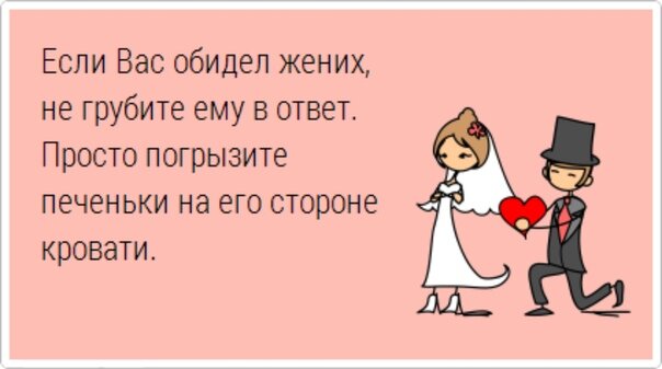 ****************************************************************************** На еврейской свадьбе отец невесты просит тамаду присматривать за столом, на котором разложены подарки: – Здесь есть такие гости, которым молодожёны не доверяют. Они таки боятся, шо пропадут подаренные им деньги. – Зачем же их в таком случае было приглашать? – Ой, ну шо вы говорите? Это ведь близкие родственники!.. ****************************************************************************** Если бросать букет невесты, сделанный из кактусов, то будет понятнее, кто действительно отчаянно хочет замуж. *******************************************************************