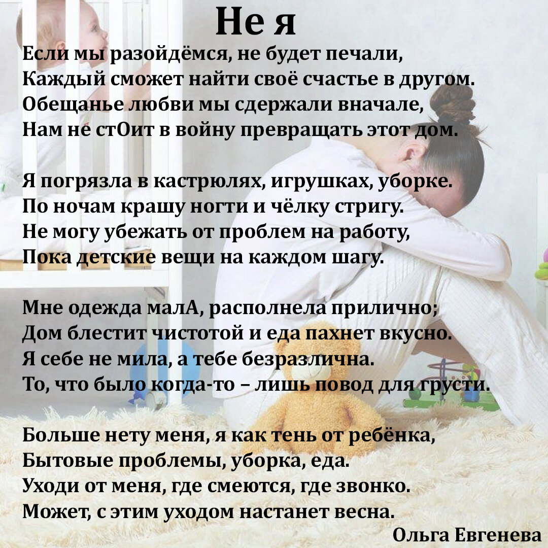 Если мы разойдёмся, не будет печали, Каждый сможет найти своё счастье в другом. Обещанье любви мы сдержали вначале, Нам не сто́ит в войну превращать этот дом. - Я погрязла в кастрюлях, игрушках, уборке. По ночам крашу ногти и чёлку стригу. Не могу убежать от проблем на работу, Пока детские вещи на каждом шагу. - Мне одежда мала́, располнела прилично; Дом блестит чистотой и еда пахнет вкусно. Я себе не мила, а тебе безразлична. То, что было когда-то – лишь повод для грусти. - Больше нету меня, я как тень от ребёнка, Бытовые проблемы, уборка, еда. Уходи от меня, где смеются, где звонко. Может, с этим уходом настанет весна. - #ольгаевгенева #стихи #любовь #стихиолюбви #семья #расставание #дети #новаяжизнь #ребенок #развод