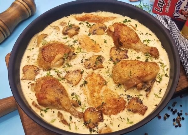 Жульен с курицей и грибами – одна из разновидностей грибного жульена. У нас чаще готовят это блюдо порционно, запекая грибы в соусе бешамель под сыром в небольших керамических соусниках. Однако можно приготовить жульен с курицей и грибами в кастрюле, сковороде или сотейнике как большое семейное блюдо, чтобы подавать кусочки курицы в сливочно-грибной подливке вместе с любимым гарниром. Приведенная здесь версия блюда – это курица с грибами и чесноком в сливочно-сметанном соусе. Блюдо очень вкусное, при этом оно красиво и презентабельно выглядит. В этом рецепте вы найдете все подробности и секреты приготовления соуса бешамель (или французского белого соуса). Вы можете использовать этот соус и в других рецептах. Ингредиенты: около 1 кг курицы (у меня 2 ножки и 1 филе); 2 ст. ложки муки (для панировки); 40 г сливочного масла (для обжаривания мяса); 1 ст. ложка муки; 60 г сливочного масла (для соуса); 400 мл молока; 200 г сметаны (жирностью 20 %); 1 яичный желток; 300 г грибов (шампиньонов);