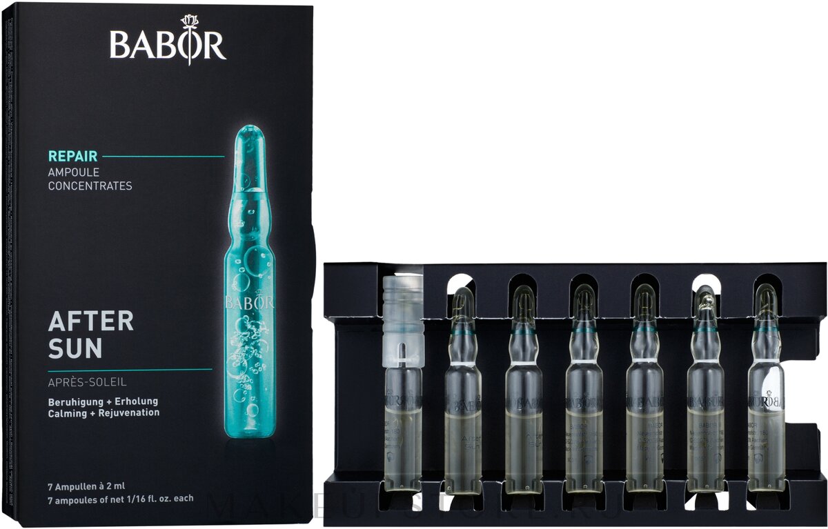 Более 80% всех морщин возникает по причине фотостарения. Именно поэтому линия ANTI-AGE КОСМЕТИКА ДЛЯ ЗАГАРА от BABOR содержит не только надежные физические и химические солнцезащитные фильтры, но также высокоэффективный ANTI-AGE КОМПЛЕКС и таким образом ведет борьбу за молодость, красоту и здоровье вашей кожи на два фронта и вдвое эффективней защищает от негативного воздействия солнечных лучей. Концентрат Ампул после Загара – отважная команда спасателей, когда кожа подает сигнал SOS после принятия солнечных ванн. Масло из семян черной смородины мгновенно снимает зуд, отечность, покраснения и раздражения. Экстракт розмарина, сахарной свеклы и сахарного тростника стимулируют процесс регенерации клеток кожи. Обладает охлаждающим эффектом. Способ применения: Ампульный концентрат наносится после очищения. Слегка встряхните ампулу, оберните её горлышко косметической салфеткой или вставьте его в прилагаемое к упаковке приспособление для открывания ампул. Резким движением отломите верхнюю част