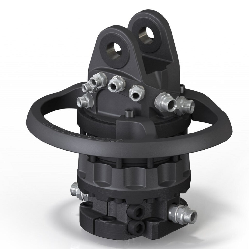 Ротатор BALTROTORS - это гидравлическое устройство, обеспечивающее вращение грейфера вокруг своей оси. В свою очередь поворотный механизм приводится в движение за счет энергии давления жидкости, получаемой от двигателя. Направление ротации изменяется путем перенаправления потока масла в гидравлической системе. А скорость вращения зависит от уровня подачи давления жидкости. При этом максимальное рабочее давление ограничено. Обычно ротатор имеет 4 гидравлических канала для циркуляции масла. Два из них используются для вращения, оставшиеся два проходят через гидравлический коллектор, то есть ротор, к грейферу или другому навесному оборудованию и отвечают за сжатие и разжатие челюстей. Как правило, харвестерные ротаторы обеспечивают только вращение. Все линии гидравлического и электрического питания, управляющие головой харвестера идут напрямую от стрелы крана, минуя ротатор. Сам же вращатель подключается снизу. Несмотря на это, ротатор является полноценным полноповоротным устройством. А в