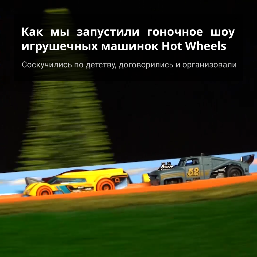 Что это? Название: шоу Горячие Гонки. Факт: с момента появления этих игрушек в 1968 году, компания уделяла особое внимание скорости их передвижения. Суть: игрушечные автомобили марки Hot Wheels соревнуются между собой, чтобы выяснить, кто из них самый быстрый. Каждая машинка весит всего 30-40 граммов. Трасса для гонок собрана из стандартных элементов для сборных трасс Hot Wheels. Чтобы дойти до финиша, участникам нужно преодолеть несколько крутых поворотов и мертвую петлю. Что мы сделали? Придумали: за время пандемии мы сильно соскучились по гонкам и детству. Мы решили сделать турнир для игрушечных машинок, чтобы найти самую быструю и везучую. Договорились: мы связались с компанией Mattel, которая производит игрушечные автомобили под маркой Hot Wheels. Они согласились нам помочь, и для них это был первый опыт такого рода, к тому же в России. Организовали: Mattel прислали детали для трассы и сами машинки. Мы подготовили студию, собрали гоночный трек и добавили декораций. Сняли: турнир