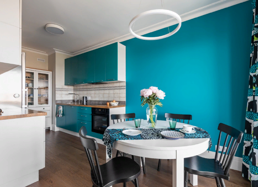 После приобретения квартиры с черновой отделкой, перед молодой семейной парой встал вопрос о планировке и ремонте. Сначала они обратились к дизайнерам, которые составили дизайн-план, затем за работу приступила бригада профессиональных отделочников Remodel. В итоге получилась современная, уютная квартира со светлым интерьером и яркими бирюзово-синими акцентами - отдельная спальня, кухня, гостиная, главный санузел, гостевой санузел + хозблок. В кухне на фоне основного светло-бежевого и белого цвета, одну стену выделили ярко-бирюзовым в виде фасада кухонных шкафов и покраски. Кухня получилась небольшая, поэтому ее разделили на три зоны - с одной стороны холодильник и рабочая поверхность для сервировки блюд, напротив для приготовления еды с варочной панелью, духовым шкафом, мойкой и посудомоечной машинкой. Обеденную зону оформили ближе к окну, там же находится выход на просторную лоджию. Стрелкой указана дверь в гостевой санузел, который расположен напротив входной двери. Гостиная - у окн
