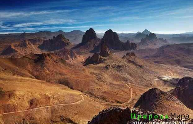 Национальный парк Ахаггар расположенный в одноименном нагорье вулканического происхождения на юго-востоке Алжира. В основном Ахаггар находится в Алжире и лишь малая часть расположена на юге Нигера и северо-востоке Ливии. Природа и культурное значение Наивысшей точкой Ахаггар и Алжира, является гора Тахат (2908 м или по другим данным 3003 м). Ахаггар славится причудливым видом своих гор. Площадь нагорья приблизительно равна площади Франции. Протяжённость с запада на восток почти 2100 км, а с севера на юг 1500 км. Местность в основном горная пустыня со средней высотой 900 метров над уровнем моря. Район заселен преимущественно народом туарегов. Крупнейшим городом-оазисом региона Ахаггар, является Таманрассет. Благодаря Эрмитажу Шарля де Фуко (католическая церковь), вершина горы Ассекрем очень популярное место среди туристов. В западной части Ахаггар городе Ин-Эккер в 60-е годы прошлого века Франция провела испытания ядерных бомб. Радиоактивные осадки привели к загрязнению окружающей среды